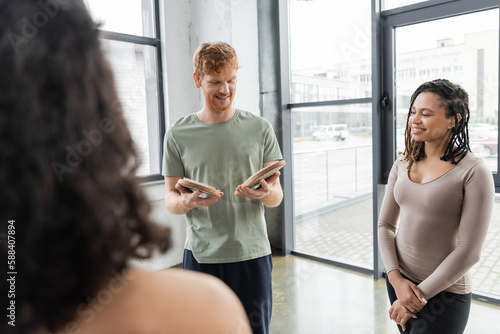 Smiling man looking at sadhu board near interracial group in yoga class.