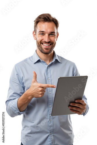 Smiling man pointing at a tablet, concept for digital solutions. Isolated on transparent background