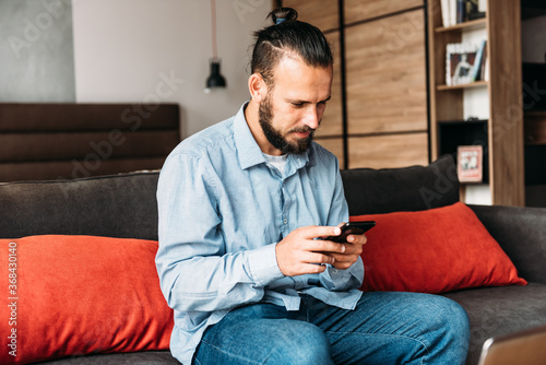 Smiling man sitting on sofa using cell phone.