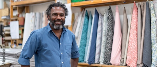 Smiling man standing in a fabric store surrounded by colorful textiles and materials during daytime