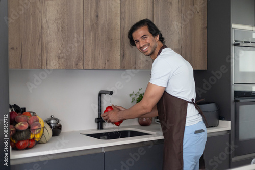 Smiling man washing vegetables at the kitchen sink while preparing a meal looking at camera