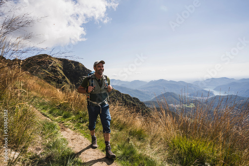 Smiling man wearing cap walking amidst grass on sunny day