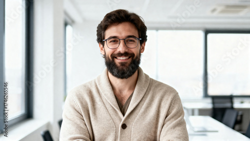 Smiling man with beard in office