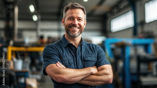 Smiling man with crossed arms in a modern workshop showcasing confidence and professionalism in a work setting