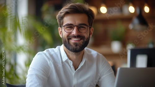 Smiling man with glasses working from home at a laptop, relaxed in a modern office, freelance career, productive work environment, natural lighting, casual professional