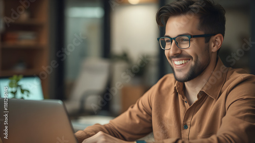 Smiling Man Working Late: A young professional with a beard and glasses smiles brightly as he works on his laptop late at night in a modern office. The image conveys a sense of focus, dedication.