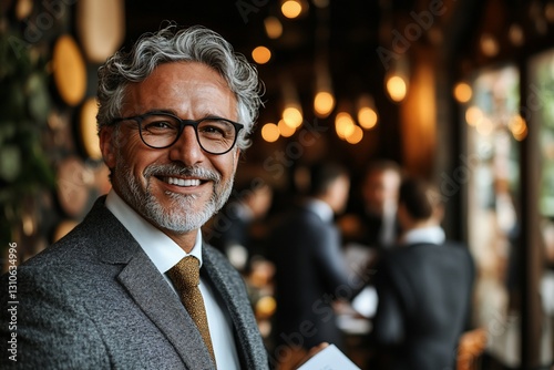 Smiling Mature Businessman in Gray Suit and Yellow Tie at a Restaurant