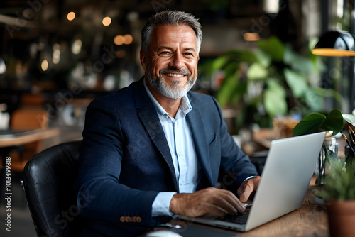 Smiling Mature Businessman Using Laptop at Desk: Professional CEO Working with Corporate Technology