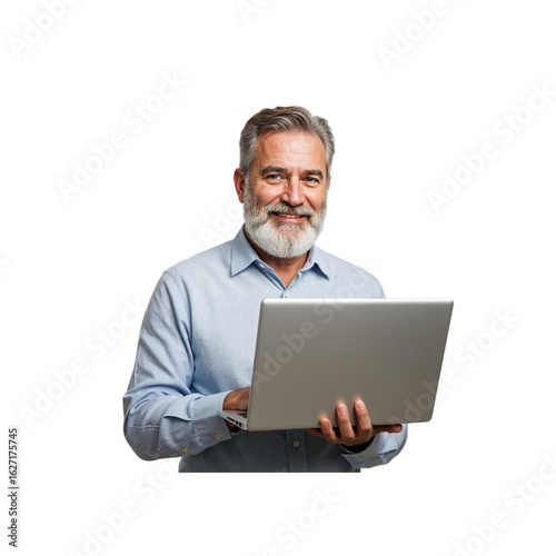 Smiling mature businessman with gray beard holding a laptop computer in his hands isolated on transparent background