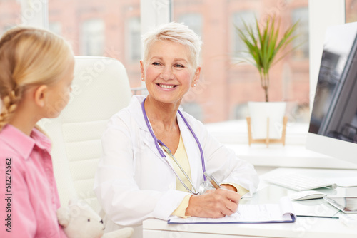 Smiling mature female doctor in lab coat sitting at desk and making notes while communicating with girl in clinic