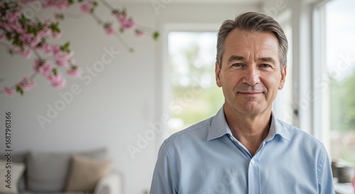 Smiling Mature Man in Blue Shirt Indoors with Blossoming Flowers