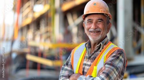 Smiling Middle Eastern Construction Worker in Safety Gear at Building Site for Industrial Campaigns, Advertisements, and Occupational Safety Promotions.