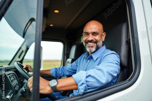 Smiling Middle-Aged Hispanic Man Driving a Truck in a Scenic Rural Landscape, Showcasing Confidence and Professionalism in Transportation