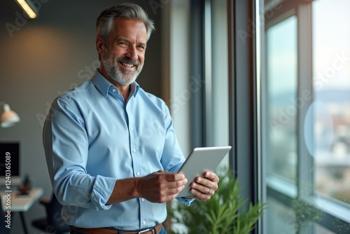 Smiling middle-aged man with gray hair and beard in blue shirt using digital tablet near large window in modern office, technology workspace concept, natural light and blurred background for business