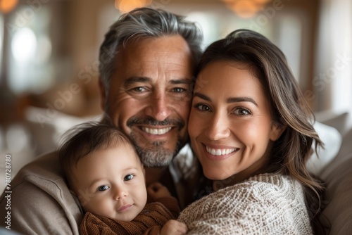 Smiling multi-generational family with a baby enjoying a tender embrace, depicting love and happiness, family bonding