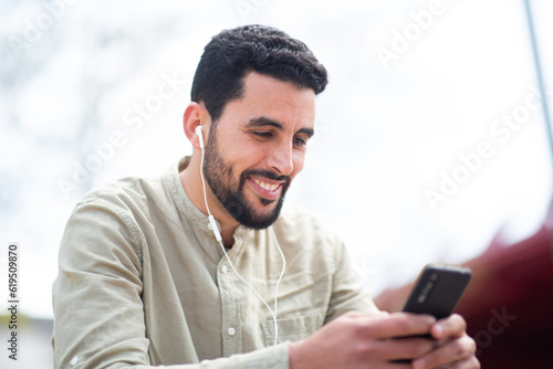 Smiling north african guy sitting outside listening to music with mobile phone