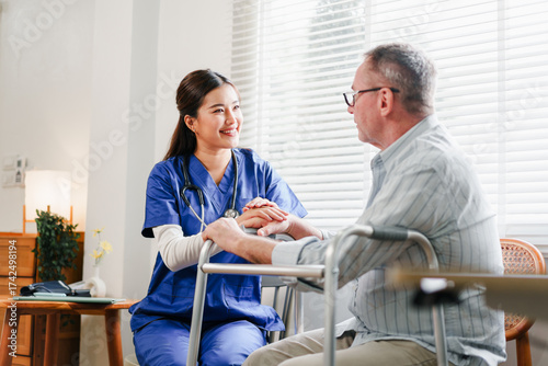 Smiling nurse holding elderly man hands while offering support in bright home setting compassionate caregiver physical therapy