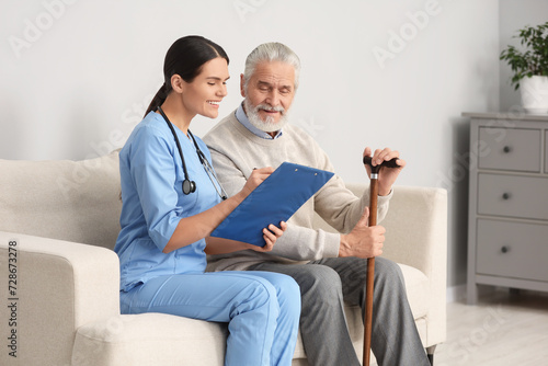 Smiling nurse with clipboard assisting elderly patient on sofa in hospital