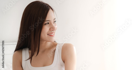 Smiling of cheerful beautiful pretty asian woman clean fresh healthy white skin posing in white clothes.Girl felling relaxing and enjoy time on the bed at home.asia beauty