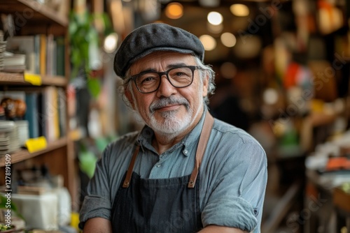 Smiling older man with glasses and a cap in a cozy cafe setting engaging with customers and showcasing culinary artistry