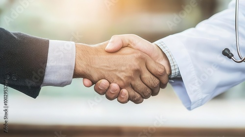 Smiling patient shaking hands with doctor at end of consultation, mutual trust evident, doctor and patient, consultation, trust