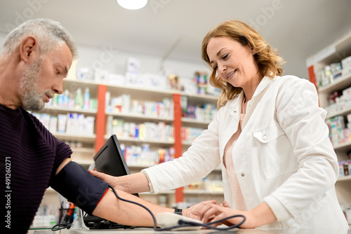 Smiling pharmacist measuring blood pressure of patient at pharmacy store