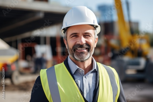 Smiling portrait of a happy white male developer or architect working on a construction site