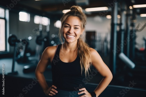 Smiling portrait of a happy young female caucasian fitness instructor working in an indoor gym