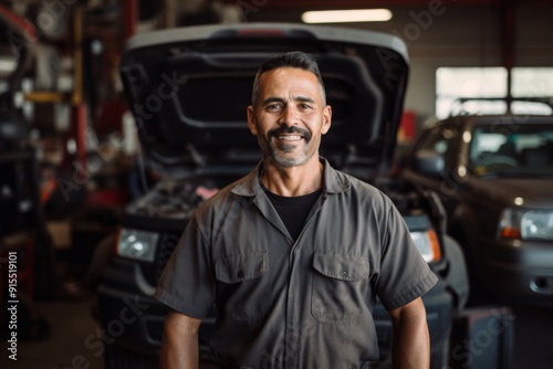 Smiling portrait of a middle aged car mechanic in workshop