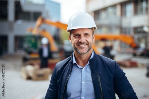 Smiling portrait of a middle aged Caucasian businessman on construction site