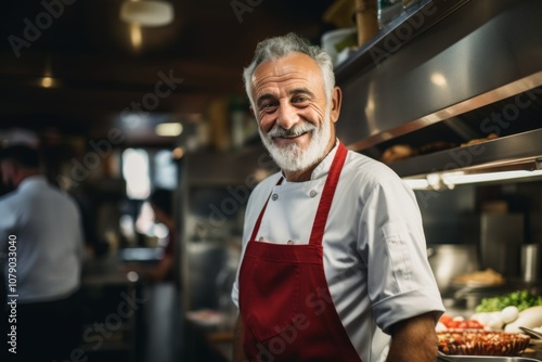Smiling portrait of a senior Italian chef working in kitchen