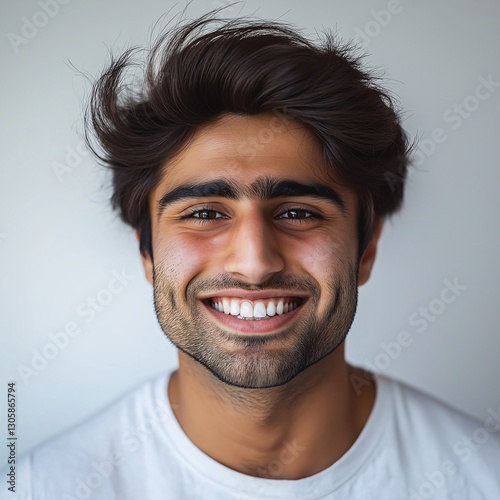 Smiling Portrait of Young Man in Casual Attire: Confident Male Model with Joyful Expression and Attractive Appearance