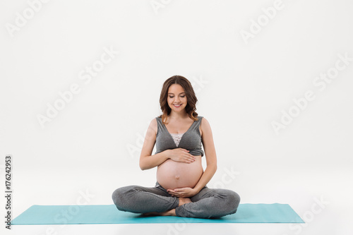 Smiling pregnant woman sitting on fitness mat and holding tummy