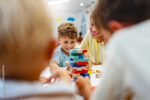 Smiling preschool boy playing with colorful wooden blocks, guided by a cheerful teacher, in a bright and lively classroom with other children in the background