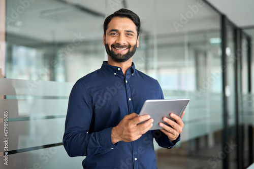 Smiling professional Indian businessman entrepreneur using tab computer working standing in office. Confident business man holding digital tablet tech device working, looking at camera. Portrait.