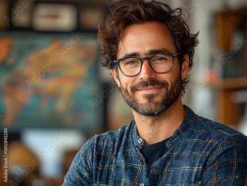 Smiling professional man in glasses with a world map background representing global entrepreneurship and innovation