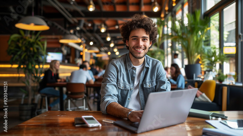 Smiling professional working on a laptop in a lively, modern café, capturing the essence of remote work and digital nomad lifestyle.