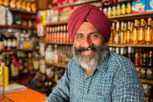 Smiling Punjabi liquor store worker in a vibrant shop filled with various beverages in the afternoon sunlight
