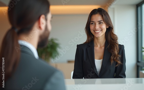 Smiling receptionist welcoming visitors at a modern company lobby. High quality