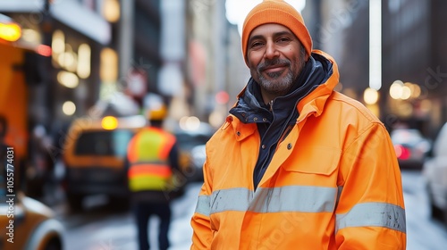 Smiling sanitation worker wearing orange jacket and beanie in new york city