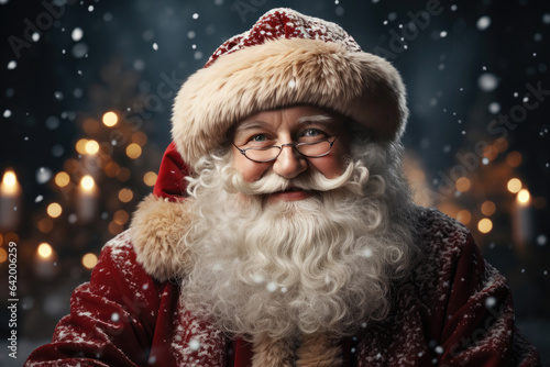 Smiling Santa Claus under a snowfall late at night on the eve of a Merry Christmas