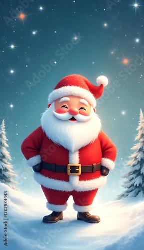 Smiling Santa Wonderland: A cute cartoon Santa standing in a snowy wonderland with twinkling stars and lovely background.