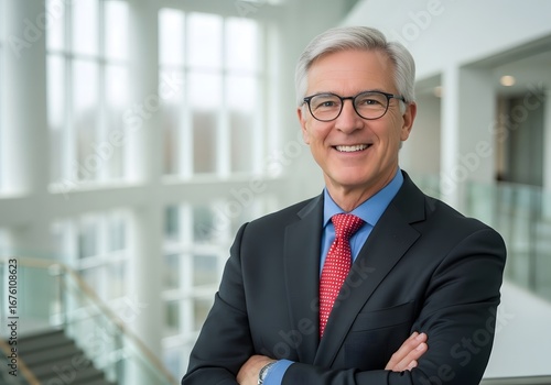 Smiling senior businessman with glasses in suit and tie standing in modern office building with arms crossed and confident expression