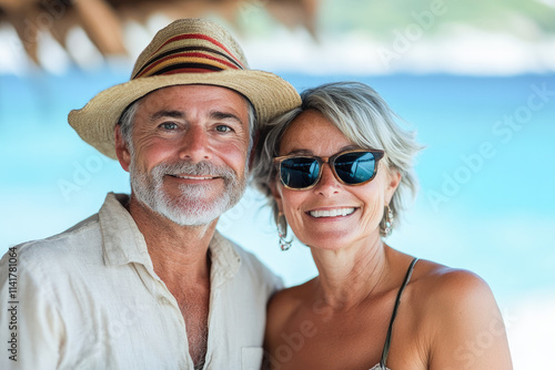 Smiling senior couple enjoying a sunny vacation by the sea, wearing stylish hats and sunglasses, symbolizing happiness, love, and carefree retirement travel.