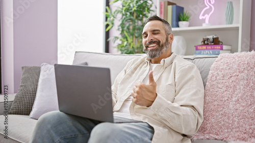 Smiling senior hispanic man with grey beard giving thumbs up while using laptop on sofa indoors.