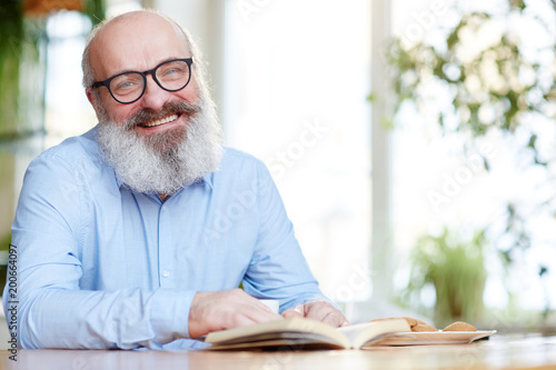 Smiling senior man in eyeglasses looking at camera while sitting by table with open book