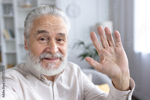 Smiling senior man waving hello in a bright room