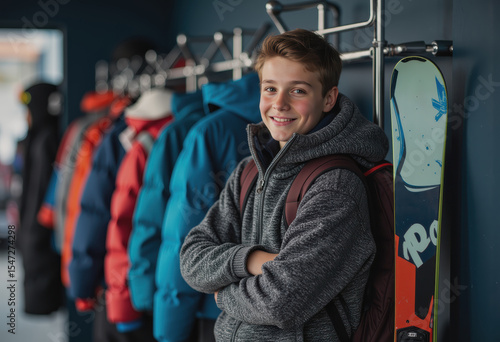 Smiling skier in a soft pullover standing by a coat rack with ski gear