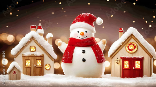 Smiling Snowman Stands Cheerfully Between Festive Snow-Covered Houses with Illuminated Windows Against a Sparkling Holiday Background