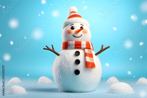 Smiling snowman with striped scarf in snowy scene on blue backdrop